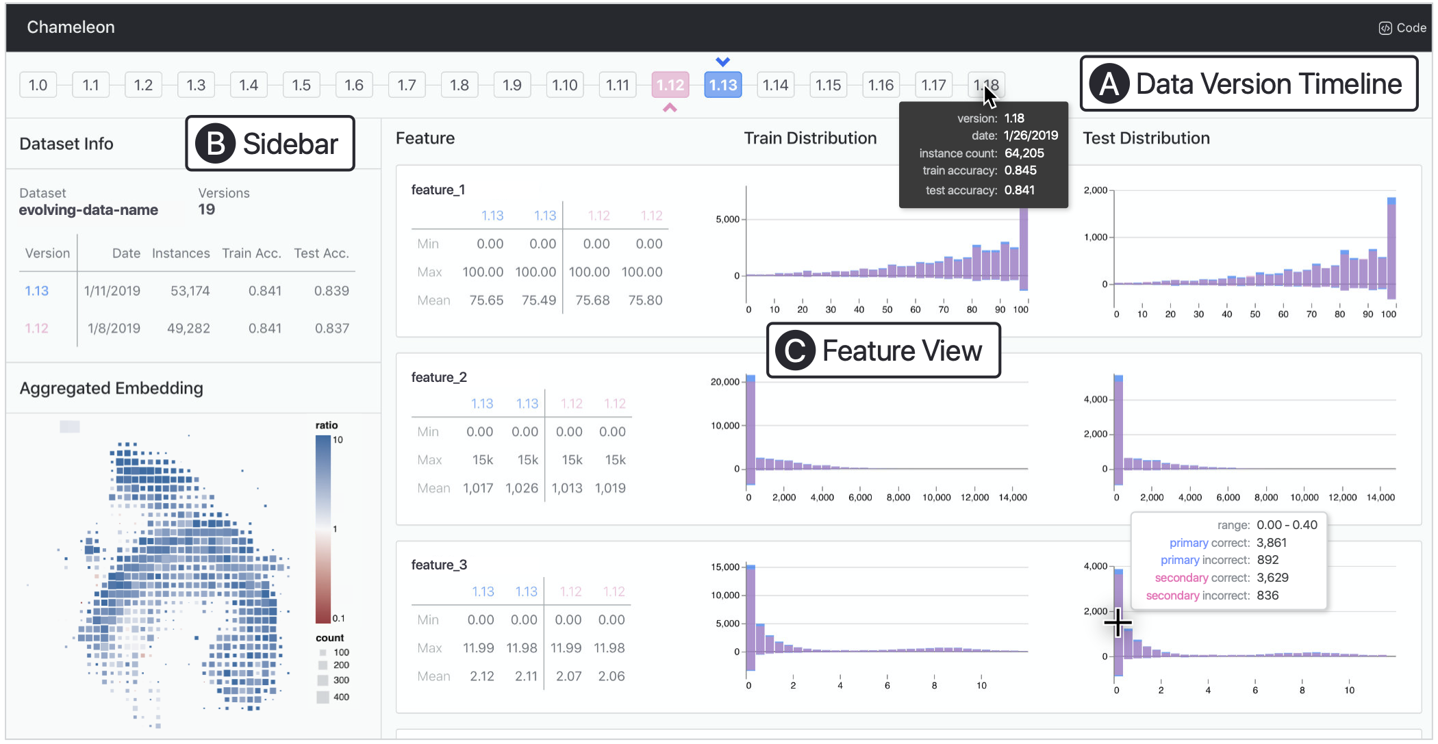 Successful machine learning (ML) applications require iterations on both modeling and the underlying data. While prior visualization tools for ML primarily focus on modeling, our interviews with 23 ML practitioners reveal that they improve model performance frequently by iterating on their data (e.g., collecting new data, adding labels) rather than their models. We also identify common types of data iterations and associated analysis tasks and challenges. To help attribute data iterations to model performance, we design a collection of interactive visualizations and integrate them into a prototype, Chameleon, that lets users compare data features, training/testing splits, and performance across data versions. We present two case studies where developers apply Chameleon to their own evolving datasets on production ML projects. Our interface helps them verify data collection efforts, find failure cases stretching across data versions, capture data processing changes that impacted performance, and identify opportunities for future data iterations.