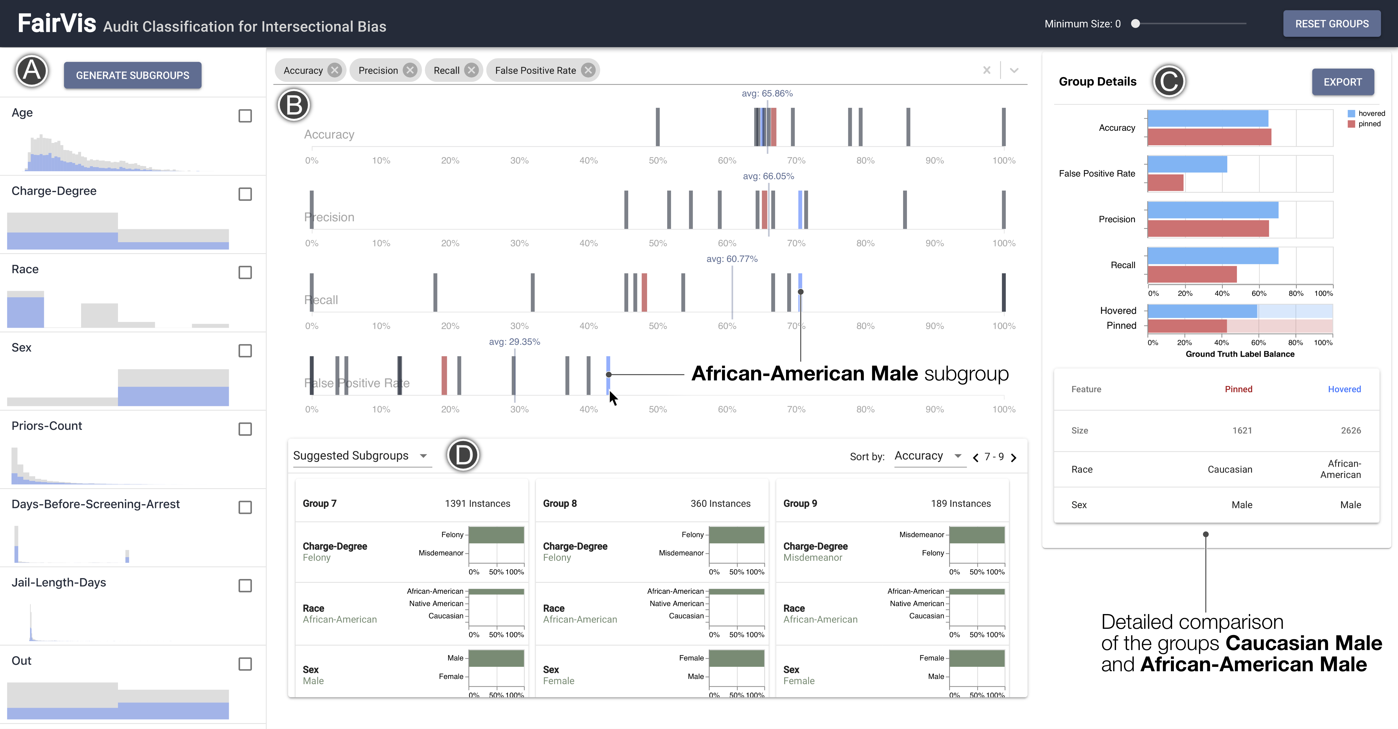 The growing capability and accessibility of machine learning has led to its application to many real-world domains and data about people. Despite the benefits algorithmic systems may bring, models can reflect, inject, or exacerbate implicit and explicit societal biases into their outputs, disadvantaging certain demographic subgroups. Discovering which biases a machine learning model has introduced is a great challenge, due to the numerous definitions of fairness and the large number of potentially impacted subgroups. We present FairVis, a mixed-initiative visual analytics system that integrates a novel subgroup discovery technique for users to audit the fairness of machine learning models. Through FairVis, users can apply domain knowledge to generate and investigate known subgroups, and explore suggested and similar subgroups. FairVis’ coordinated views enable users to explore a high-level overview of subgroup performance and subsequently drill down into detailed investigation of specific subgroups. We show how FairVis helps to discover biases in two real datasets used in predicting income and recidivism. As a visual analytics system devoted to discovering bias in machine learning, FairVis demonstrates how interactive visualization may help data scientists and the general public understand and create more equitable algorithmic systems.