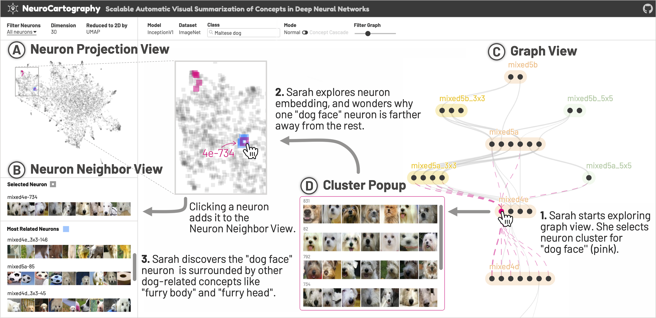Existing research on making sense of deep neural networks often focuses on neuron-level interpretation, which may not adequately capture the bigger picture of how concepts are collectively encoded by multiple neurons. We present NeuroCartography, an interactive system that scalably summarizes and visualizes concepts learned by neural networks. It automatically discovers and groups neurons that detect the same concepts, and describes how such neuron groups interact to form higher-level concepts and the subsequent predictions. NeuroCartography introduces two scalable summarization techniques: (1) neuron clustering groups neurons based on the semantic similarity of the concepts detected by neurons (e.g., neurons detecting “dog faces” of different breeds are grouped); and (2) neuron embedding encodes the associations between related concepts based on how often they co-occur (e.g., neurons detecting “dog face” and “dog tail” are placed closer in the embedding space). Key to our scalable techniques is the ability to efficiently compute all neuron pairs’ relationships, in time linear to the number of neurons instead of quadratic time NeuroCartography scales to large data, such as the ImageNet dataset with 1.2M images. The system’s tightly coordinated views integrate the scalable techniques to visualize the concepts and their relationships, projecting the concept associations to a 2D space in Neuron Projection View, and summarizing neuron clusters and their relationships in Graph View. Through a large-scale human evaluation, we demonstrate that our technique discovers neuron groups that represent coherent, human-meaningful concepts. And through usage scenarios, we describe how our approaches enable interesting and surprising discoveries, such as concept cascades of related and isolated concepts. The NeuroCartography visualization runs in modern browsers and is open-sourced.