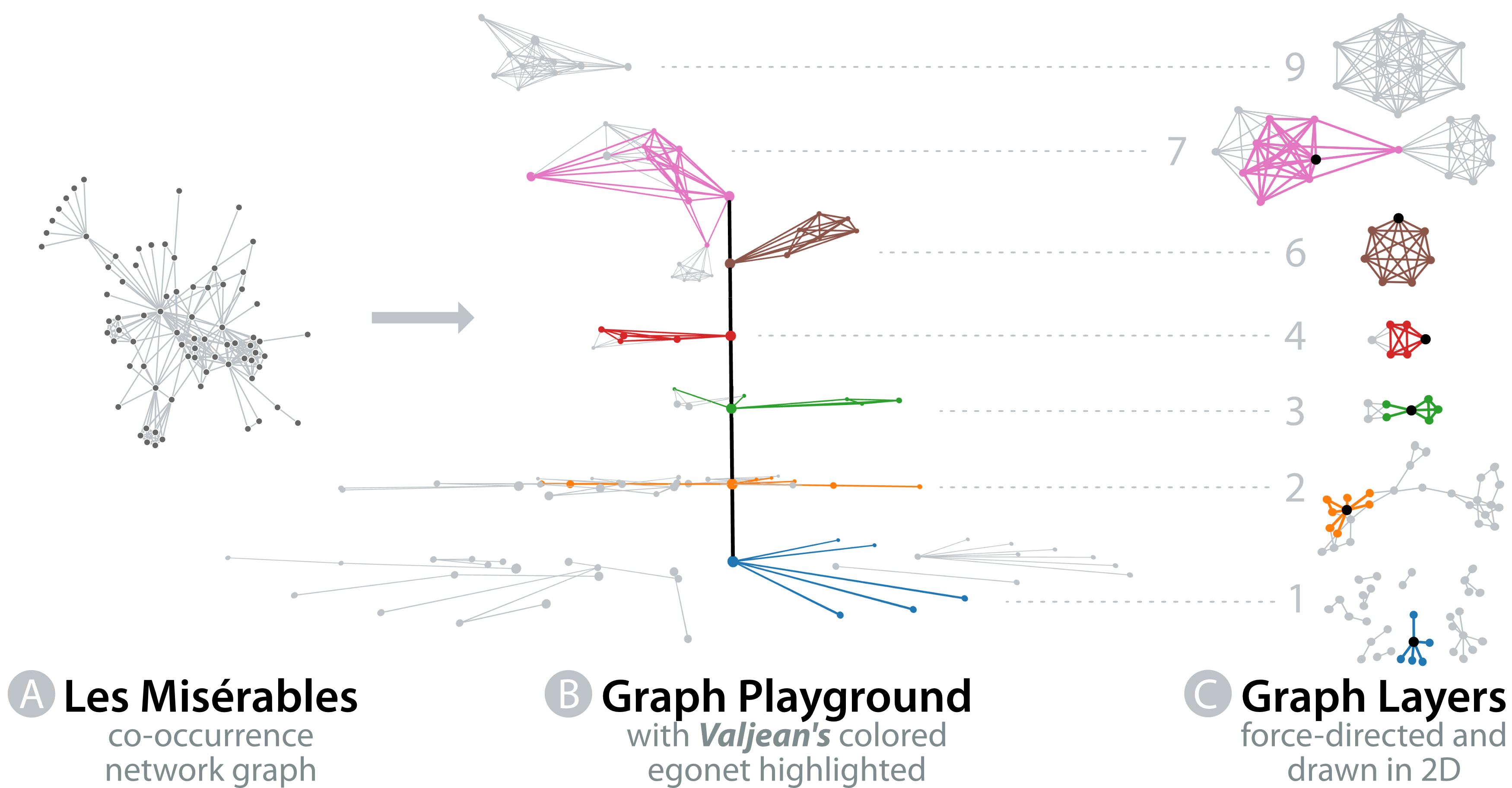 We use an iterative edge decomposition approach, derived from the popular iterative vertex peeling strategy, to globally split each vertex egonet (subgraph induced by a vertex and its neighbors) into a collection of edge-disjoint layers. Each layer is an edge maximal induced subgraph of minimum degree k that determines the layer density. This edge decomposition is derived completely from the overall network topology, and since each vertex can appear in multiple layers, we can associate to each vertex a vector profile that can be used to identify its different “roles” across the network. This allows us to explore a network’s topology at different levels of granularity, e.g., per layer and across layers. This is only feasible by mapping simultaneously a vertex to a set of 3D coordinates (x, y, and z) where the third coordinate encodes the different layers a vertex belongs to. This is one of the few instances where 3D visualization enhances graph exploration and navigation in an arguably “natural” way: a graph now becomes a 3D graph playground where a vertex plays a certain “role” per layer that is determined by the overall network topology. Our approach helps disentangle “hairball” looking embeddings produced by conventional 2D graph drawings.