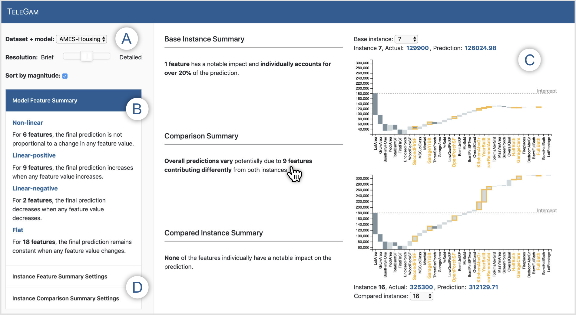 TeleGam: Combining Visualization and Verbalization for Interpretable Machine Learning