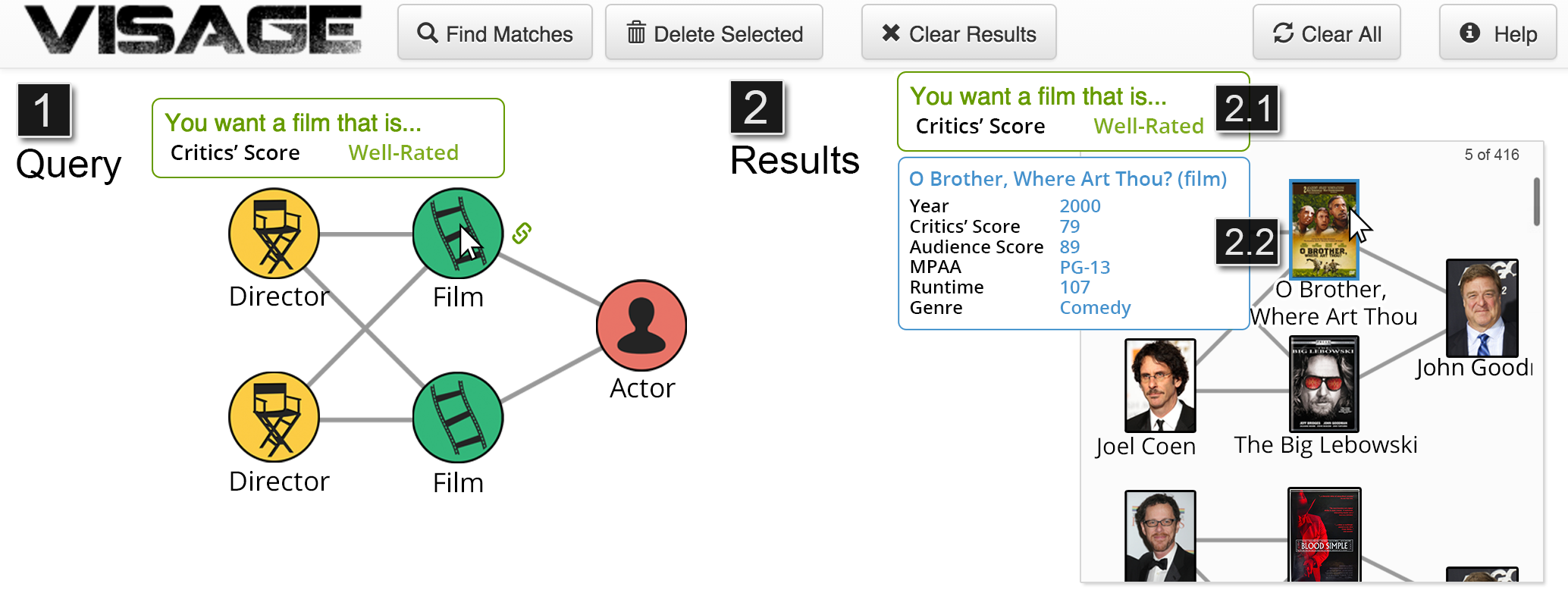 Locating and extracting subgraphs from large network datasets is a challenge in many domains, one that often requires learning new querying languages. We will present the first demonstration of Visage, an interactive visual graph querying approach that empowers analysts to construct expressive queries, without writing complex code. Visage guides the construction of graph queries using a data-driven approach, enabling analysts to specify queries with varying levels of specificity, by sampling matches to a query during the analyst’s interaction. We will demonstrate and invite the audience to try Visage on a popular film-actor-director graph from Rotten Tomatoes.