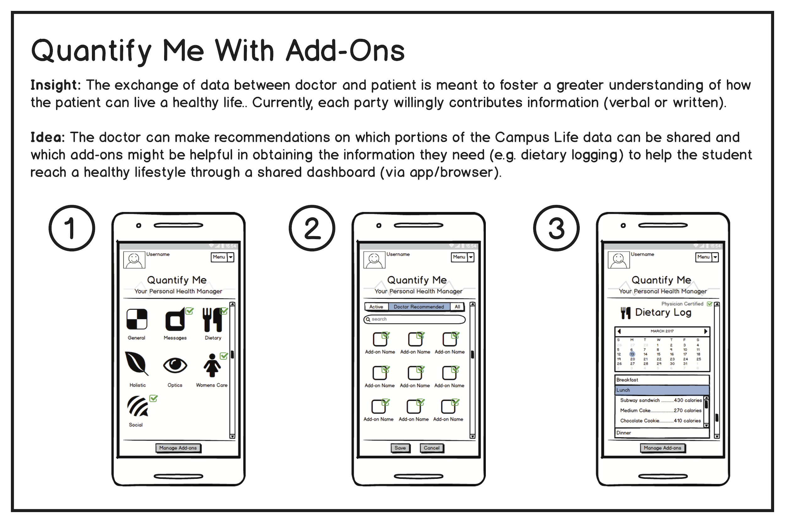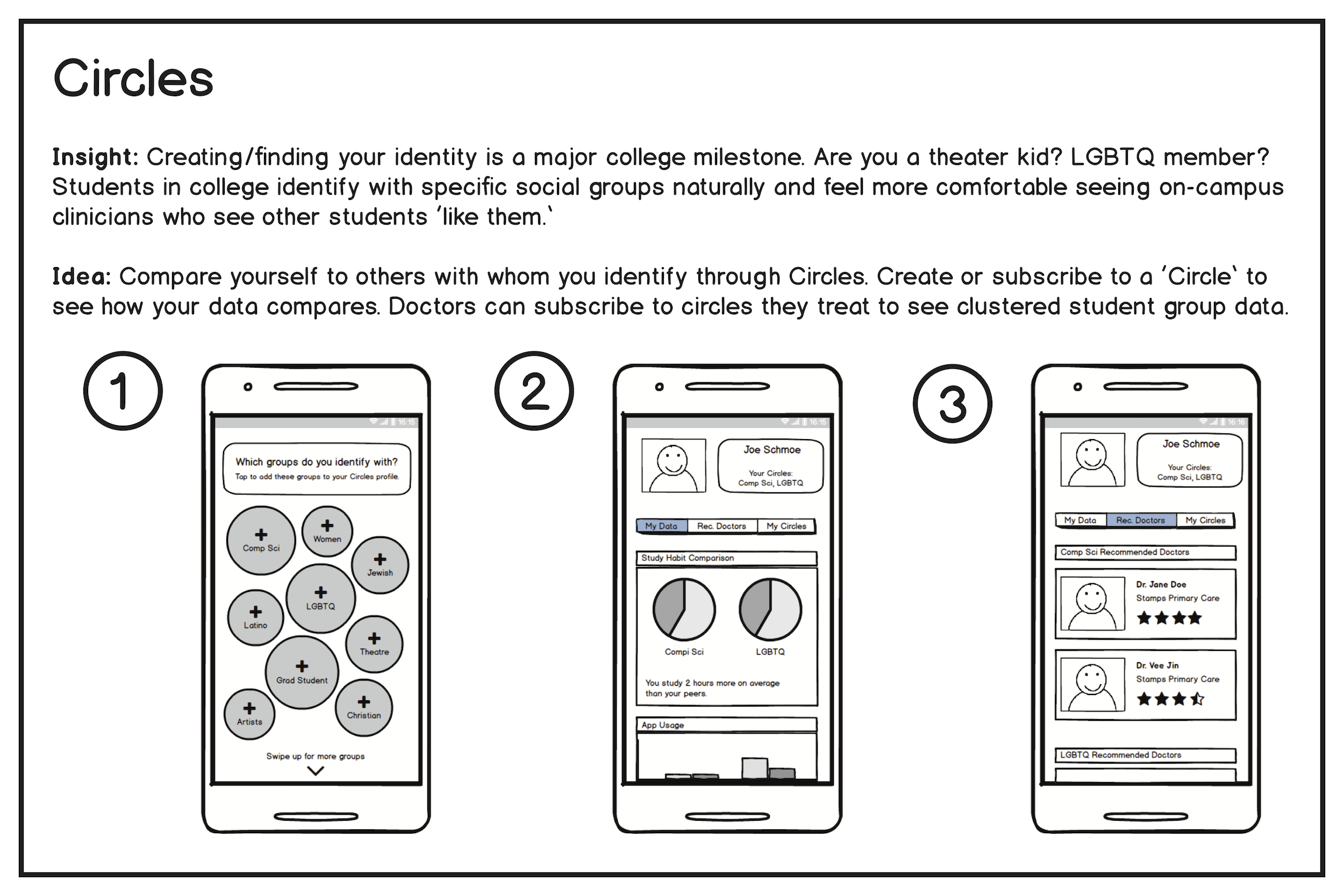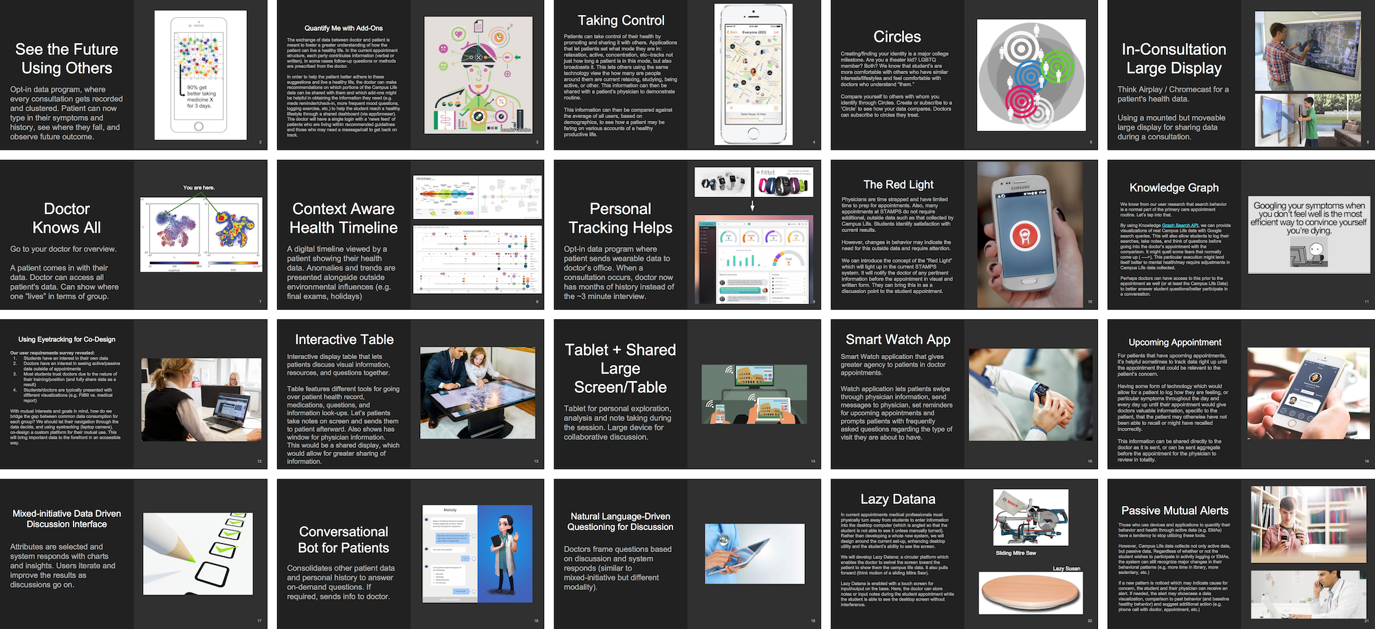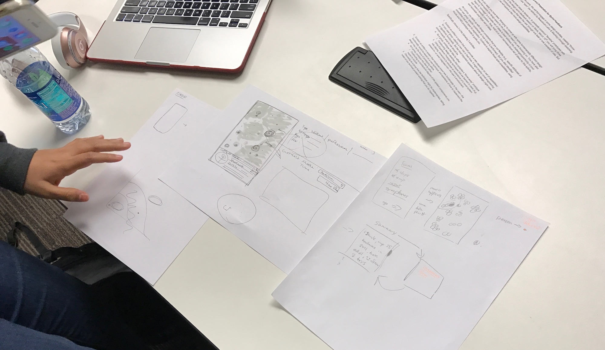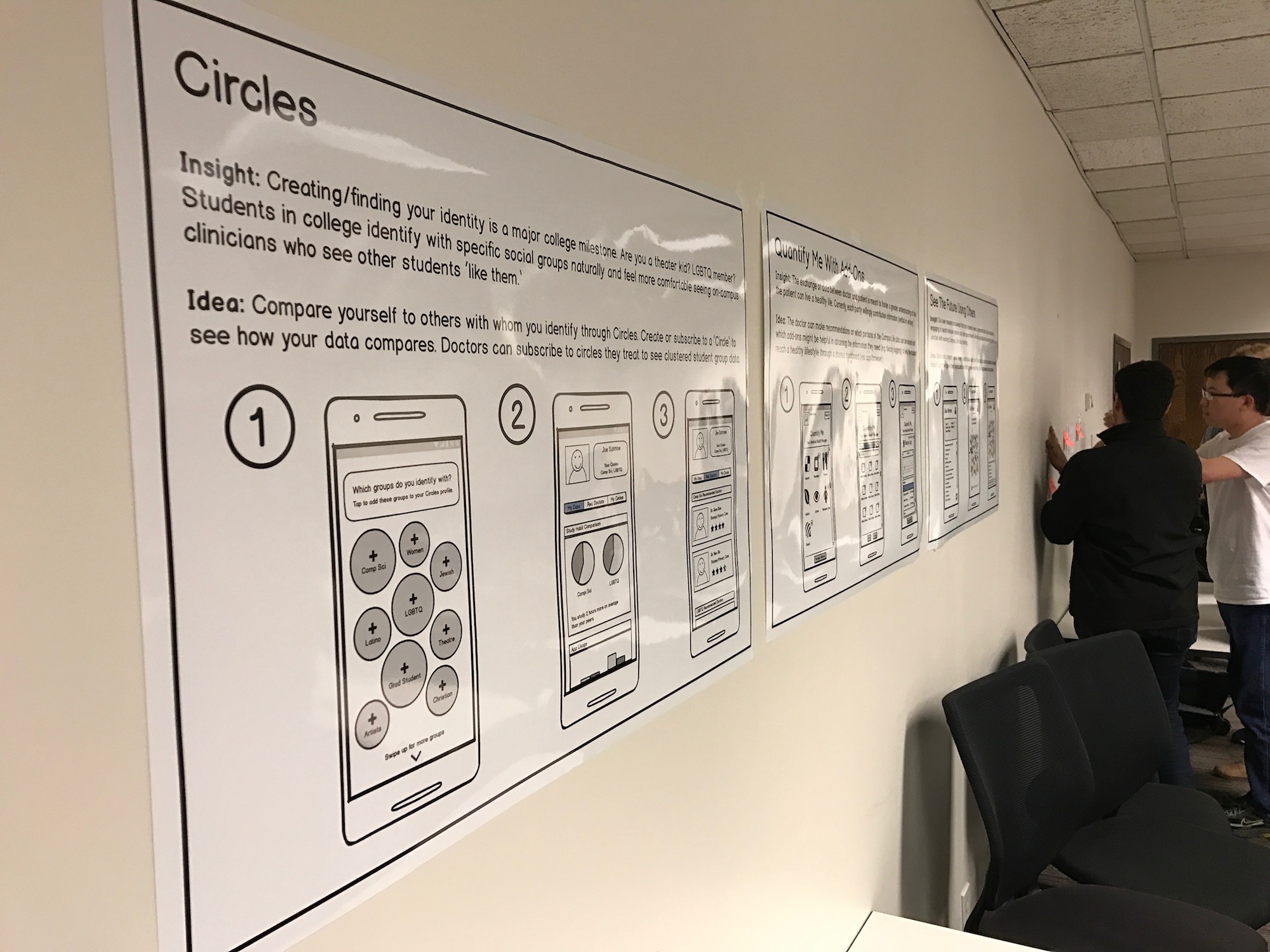 With these three ideas, we storyboarded each for a poster presentation. The ideas ranged from a completely human-centered health identification system to a data-driven system that visualizes social context. Classmates anonymously voted for each idea using colored stickers.