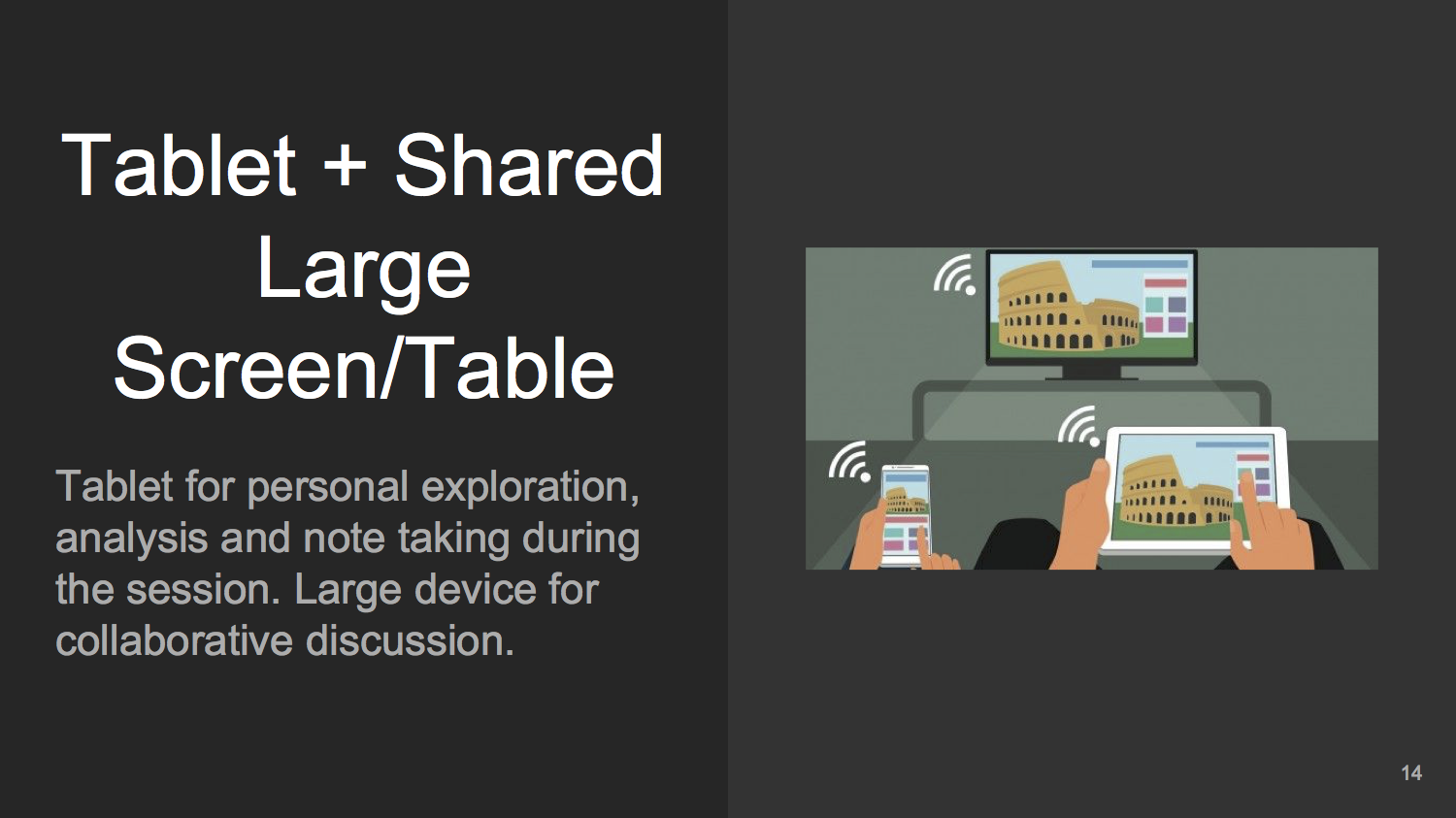 - Thinks it should record the session, maybe records both interaction with the device as well as voices. Different color interactions to indicate who is moving or manipulating what information.