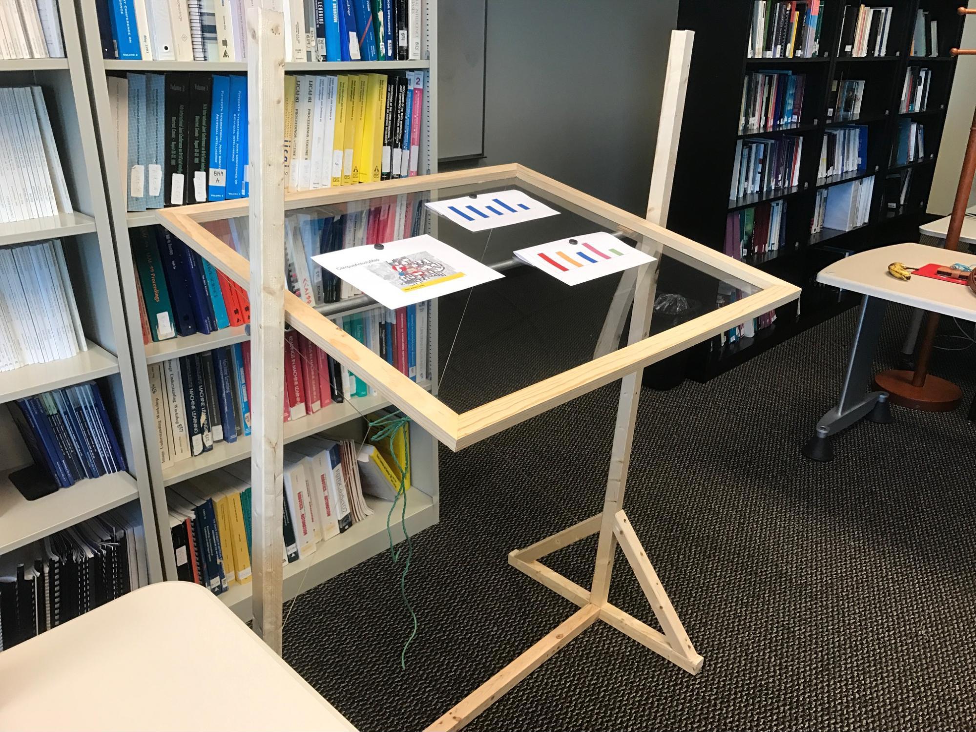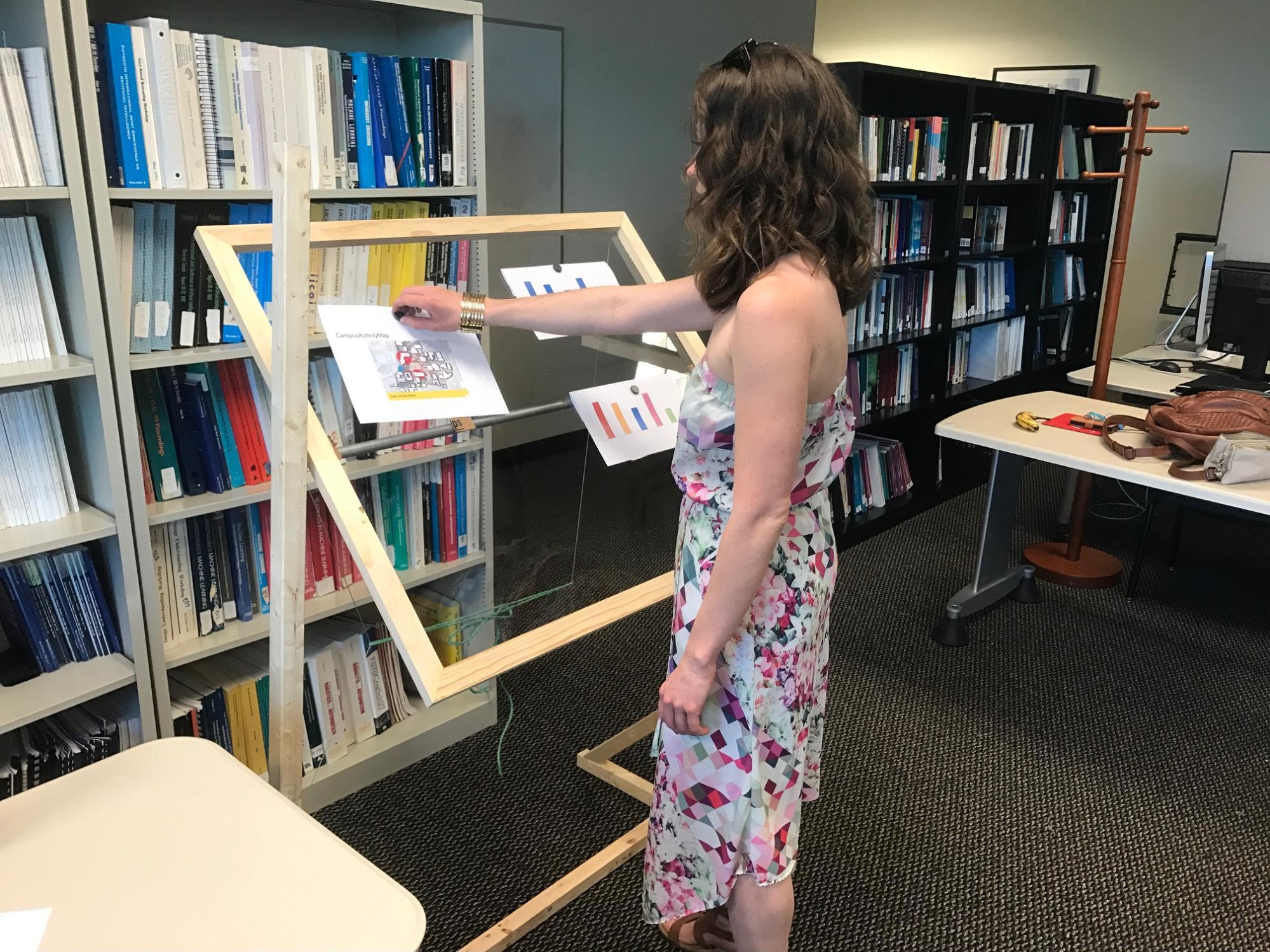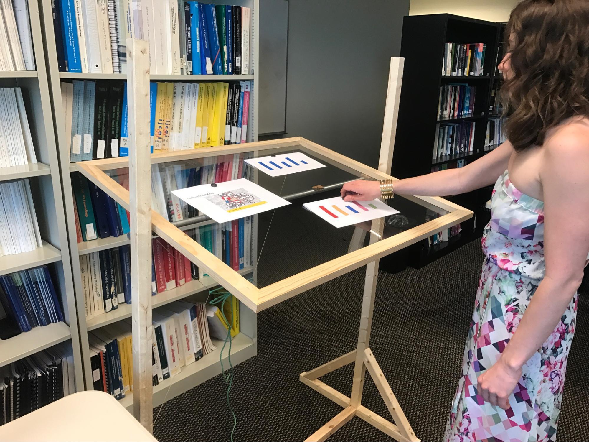 The Health Easel prototype allows users, both patients and doctors, to conduct Wizard of Oz using magnets that hold paper visualizations from the front and back to accurately mimic window movement on a transparent touch display.