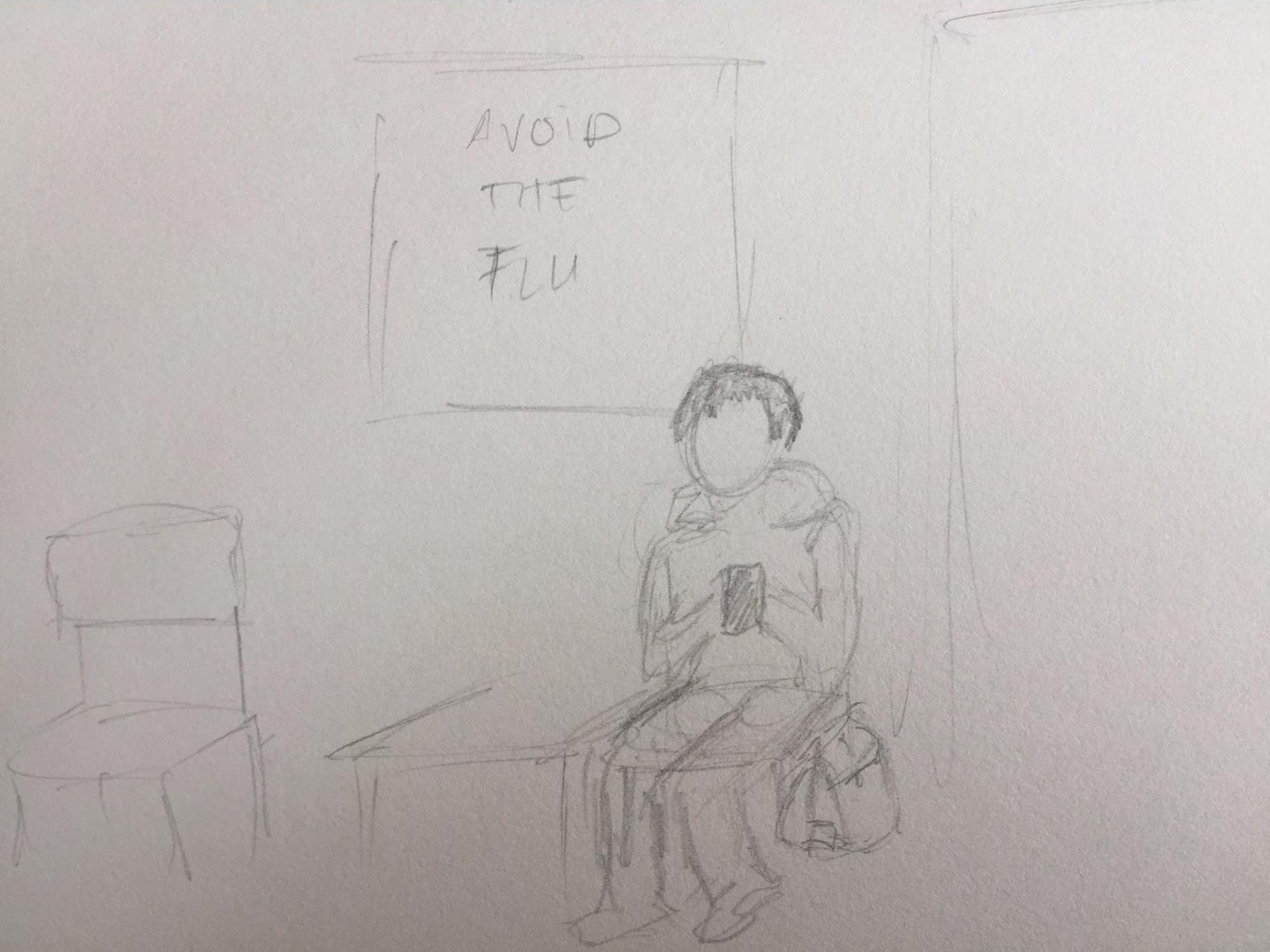 R: Student waits in primary care center lobby. Typically students spend waiting time browsing their mobile phones.